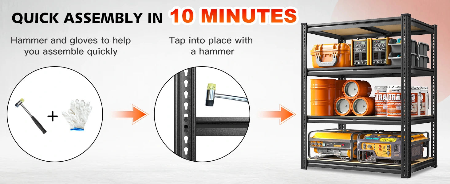 - The garage shelving adopts a special interlocking design to make shelf quickly assembled, which is not require the use of complex installation tools such as screws.