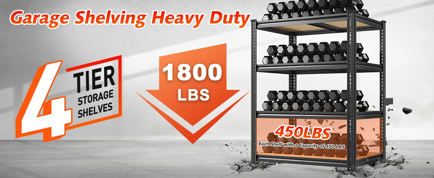 - The shelves are made of thickened and high-quality metal frame and high-density boards, so each shelf of the storage shelves can hold up to 450 lbs, and entire shelving can bear 1800LBS.