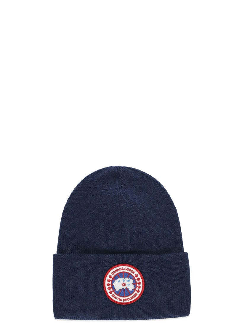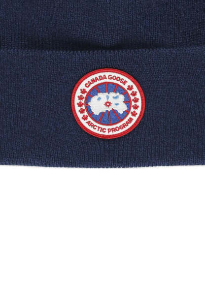 The Arctic Toque Beanie by Canada Goose is a fashionable accessory made from high-quality soft wool. It features a deep navy blue ribbed knit and a folded cuff, complemented by a bold contrasting oval patch in red, white, and blue. This beanie is designed to provide warmth and comfort while enhancing your casual style with its unique design and luxurious texture.