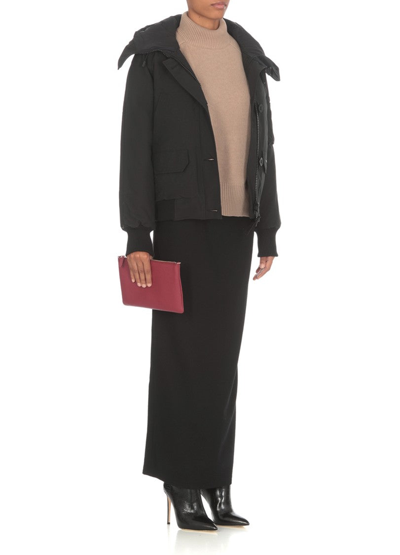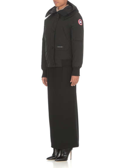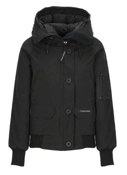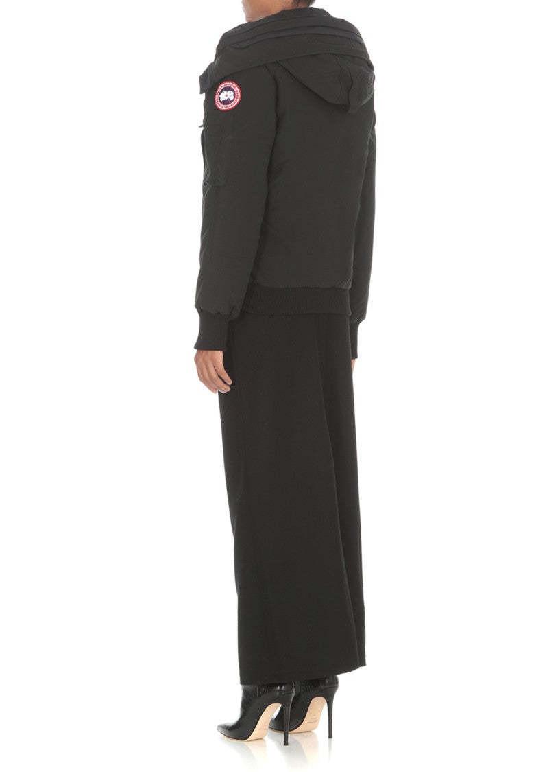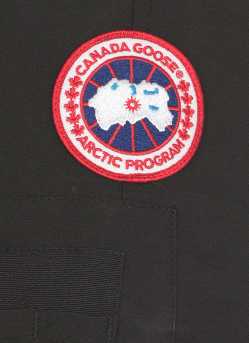 Canada Goose down jacket in black, made from advanced tech fabric for warmth and style. It includes a high neck and hood, with a contrasting logo patch on the left sleeve. The jacket offers ample storage through multiple pockets, including flap and slit options, and features elastic ribbed trims for a comfortable fit.