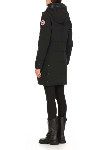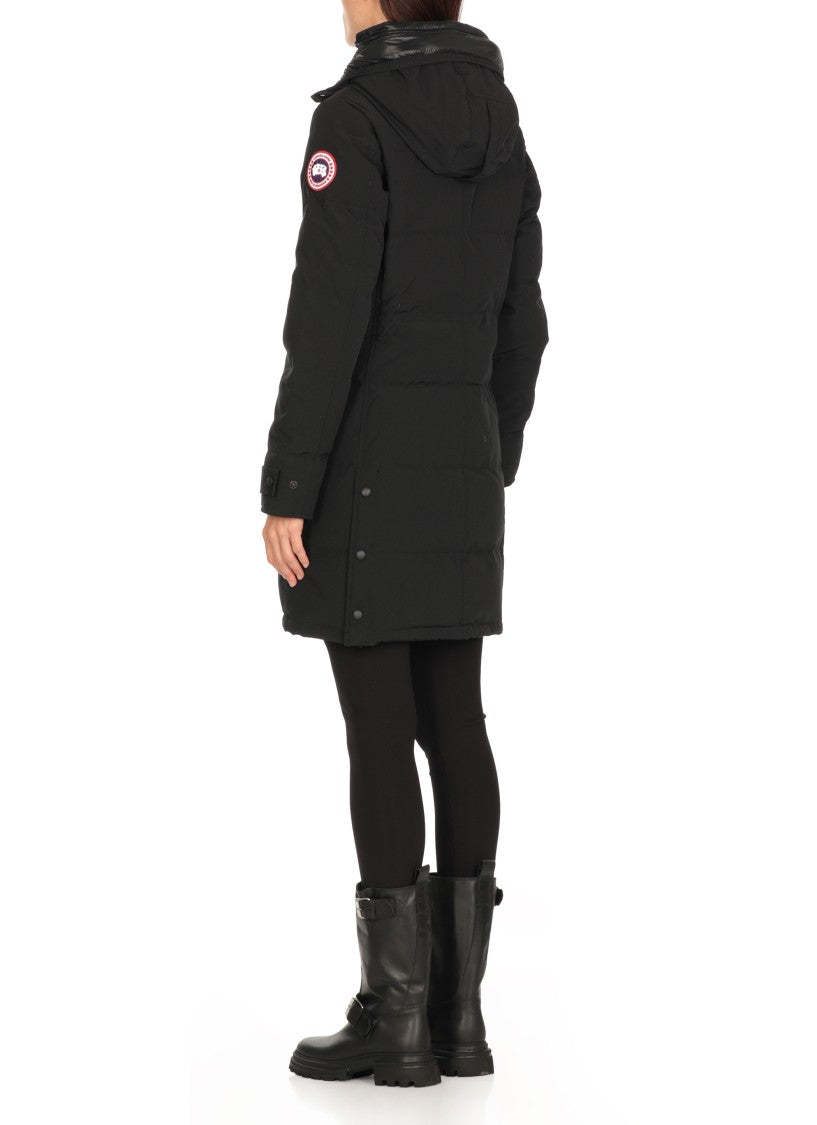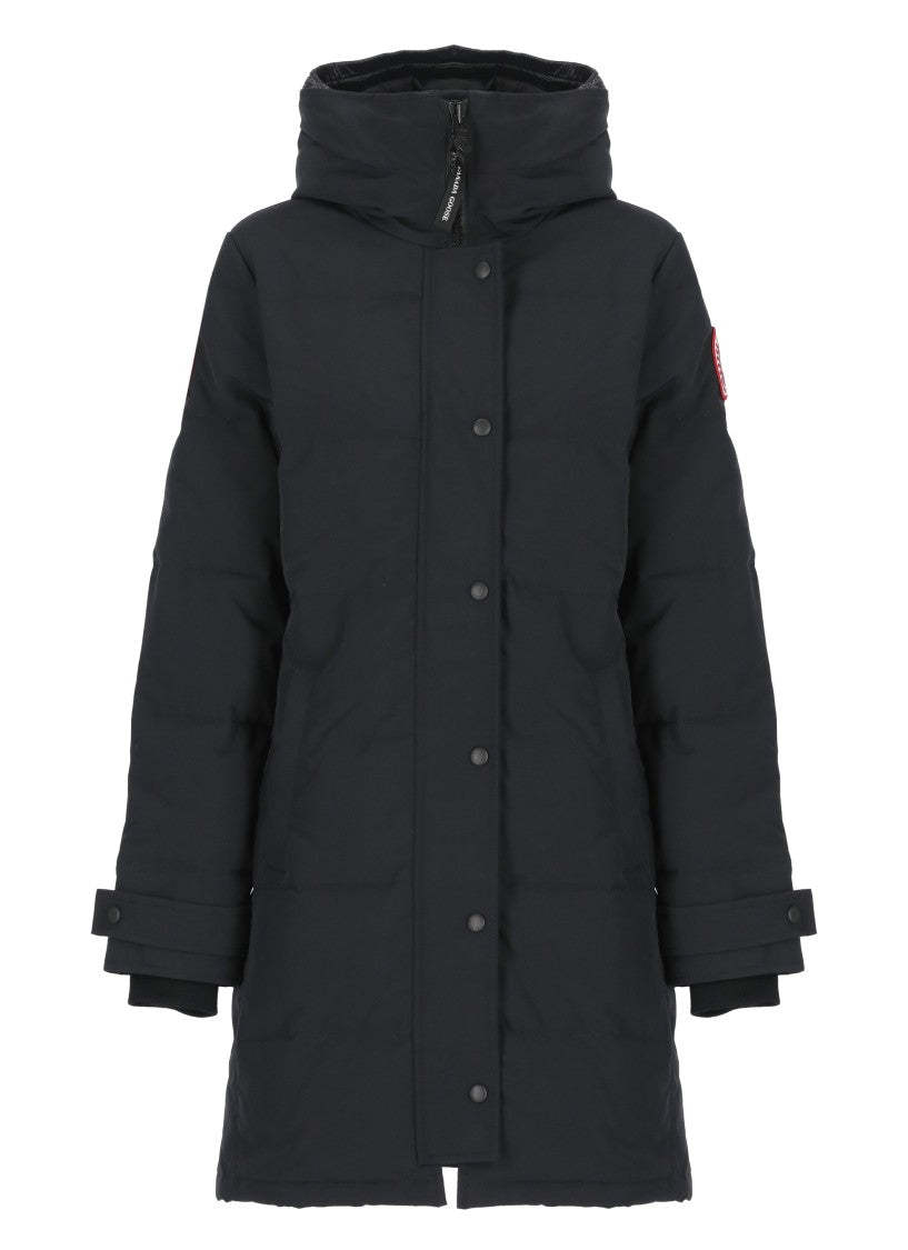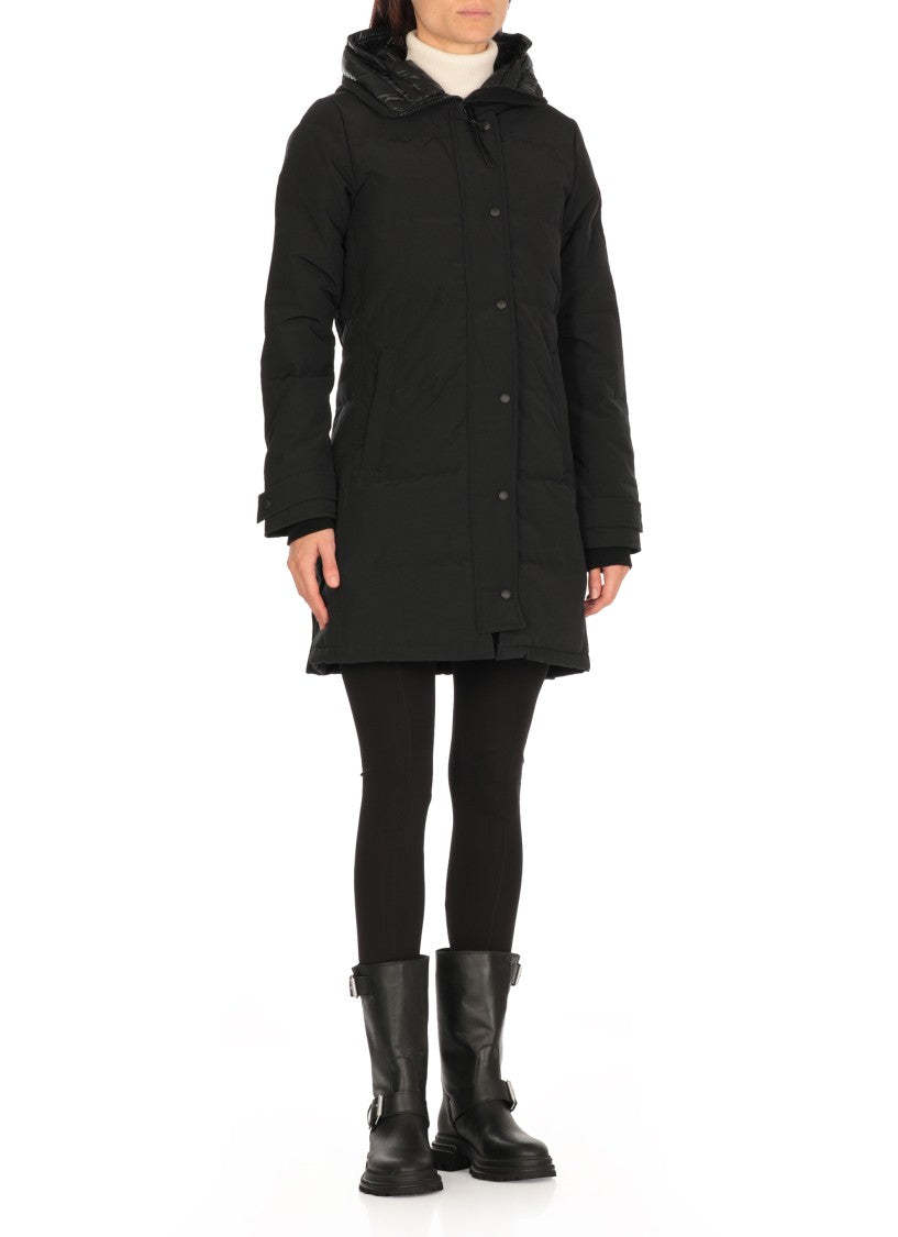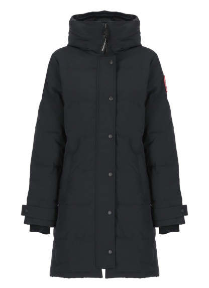 Stay warm with the Shelburne Down Jacket, made from advanced Canada Goose tech fabric. This luxurious piece includes a high neck and hood for optimal protection against the elements. The elegantly quilted padding provides comfort, while long sleeves with elastic cuffs ensure a snug fit. It features two front snap button pockets and two interior welt pockets for secure storage. A distinctive contrasting logo patch is located on the left sleeve, and the innovative front closure combines a zipper with snap buttons for a polished look.