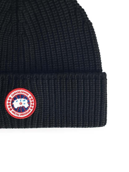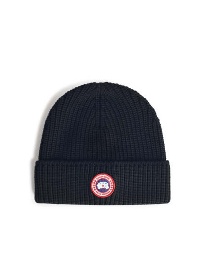 This ribbed knit beanie by Canada Goose is made from soft wool, providing warmth and comfort. The folded cuff design adds a classic touch, while the round contrast logo patch enhances its style, making it a versatile accessory for casual outfits.
