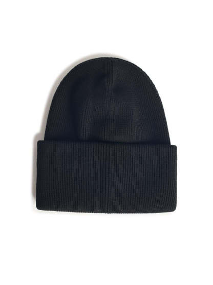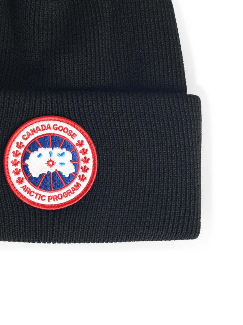 Canada Goose offers a ribbed knit beanie made from 100% premium wool, providing both warmth and a touch of casual sophistication. The beanie features a foldable edge and a circular embroidered logo patch, adding a unique detail that stands out against the solid textured fabric.