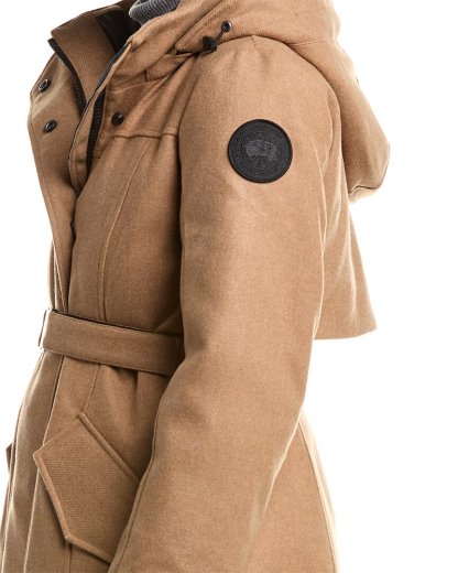 Stay warm and stylish with the Canada Goose Bala Wool Parka in Brown. This functional and versatile outerwear piece is designed with a zipper and snap front closure, ensuring maximum warmth and protection against the elements. Made in Canada from a blend of recycled wool, Tencel™ Lyocell, nylon, and polyester twill, this parka features 90% down and 10% feather fill for ultimate comfort. The Bala Wool Parka measures approximately 48 inches from shoulder to hem and is available in various sizes to suit your preferences. Whether you're heading on an outdoor adventure or just running errands in the city, this parka is a must-have addition to your winter wardrobe. Add a touch of luxury and practicality to your look with this authentic Canada Goose piece.