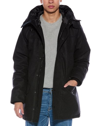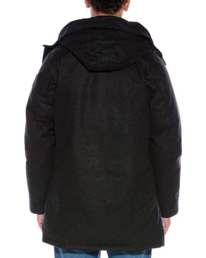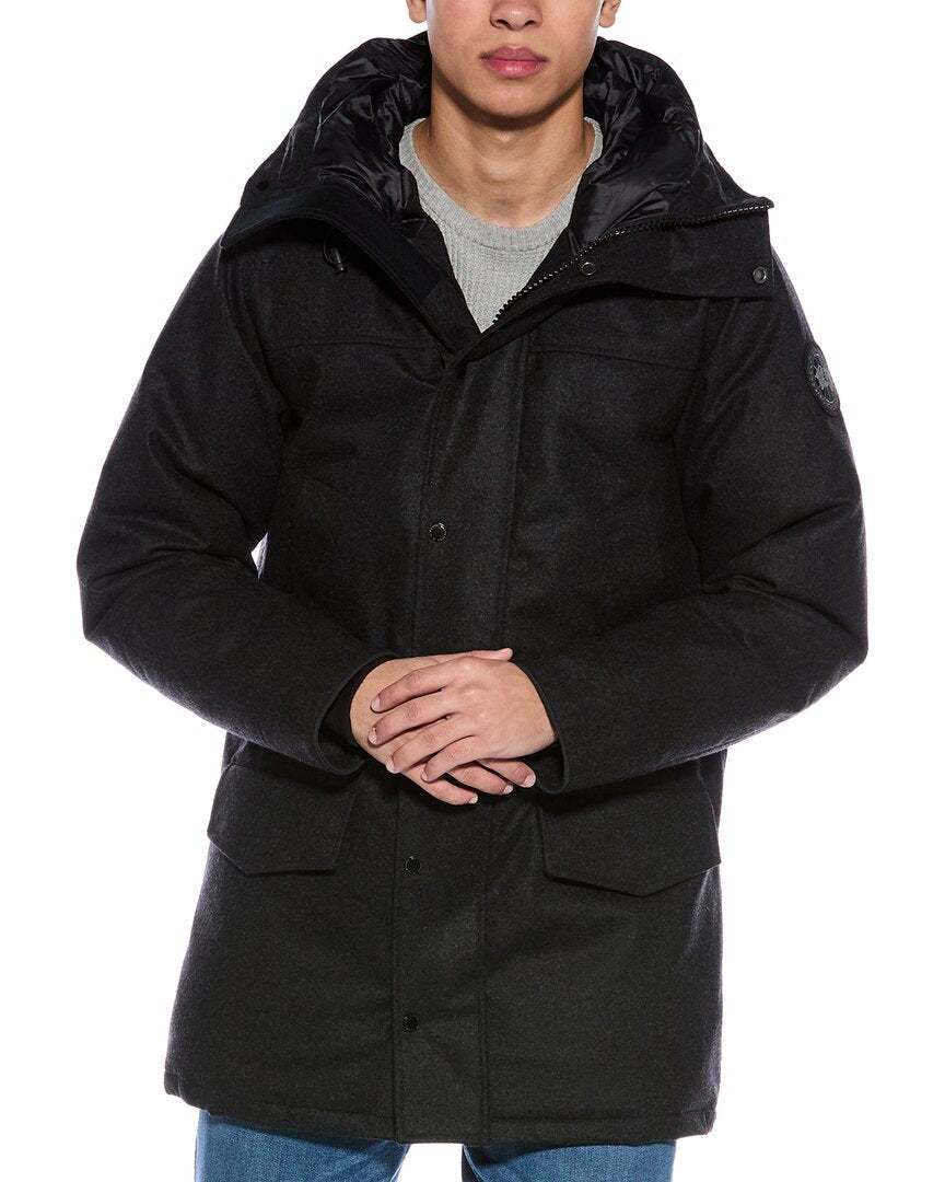 Introducing the Canada Goose Langford Wool-Blend Down Parka, a functional and stylish outerwear option for the modern man. This parka, in classic black, features a drawcord hood, four front pockets, patch logo at the sleeve, ribbed inner cuffs, and inner drawcord at the waist for added comfort and adjustability. Measuring approximately 36 inches from shoulder to hem, this parka is designed to provide ample coverage and warmth. The model is 6'3 and is wearing a size medium, but please note that measurements may vary slightly by size. The Langford parka is constructed with a heavy-weight shell made from 72% recycled wool, 23% polyamide, and 5% other fibers. The lining is 100% polyester, while the fill consists of 80% duck down and 20% feather for superior insulation. This parka is fastened with both zipper and snap closures, ensuring a secure fit. For care instructions, please dry clean only. Made in Canada, this parka is a true testament to Canada Goose's commitment to quality and craftsmanship.When you shop with us, rest assured that all our products are 100% genuine. While we may source some items from trusted independent suppliers, we guarantee the authenticity of every product sold on our site. Choose the Canada Goose Langford Wool-Blend Down Parka for a versatile and enduring addition to your cold weather wardrobe.