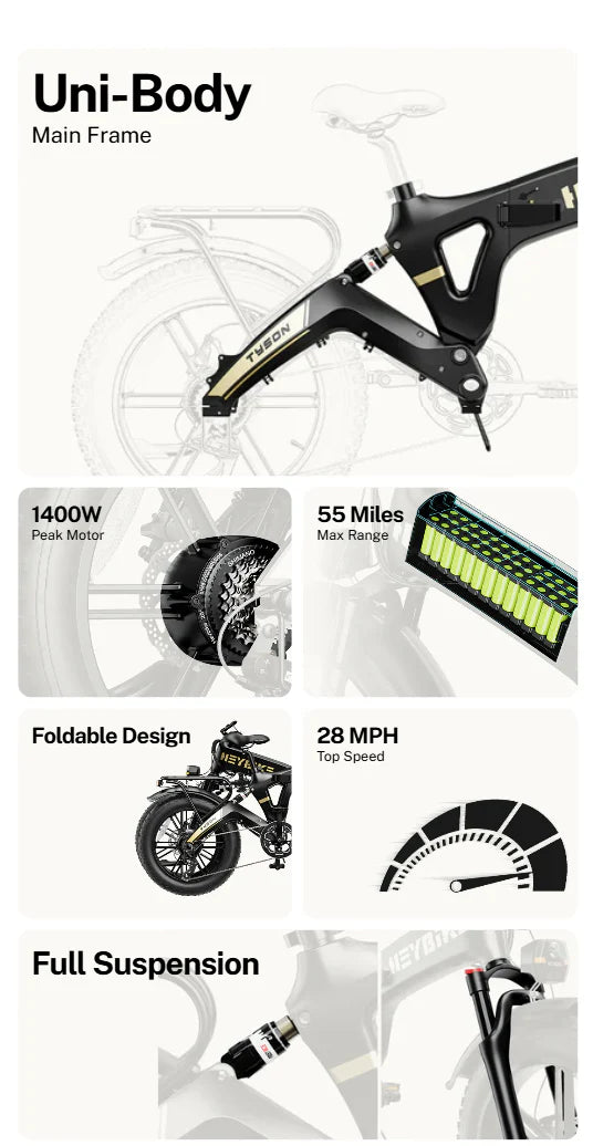 The Folding Fat Fire Ebikes features a uni-body design with a magnesium frame for higher quality and safety. It runs up to 55 miles with a 750W motor. Tyson is here to offer you a comfortable and exciting riding experience in any condition.