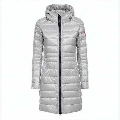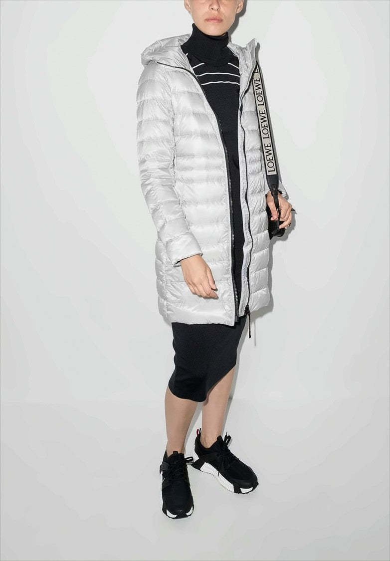 Canada Goose, renowned for its exceptional craftsmanship, presents a long padded jacket that embodies style and practicality. This sleek piece, designed with a fitted silhouette and horizontal quilted stitching, features a cozy hood, a front zipper closure, and convenient side pockets. The thoughtful button details at the hem enhance its chic appeal, making it a versatile choice for any winter outing.